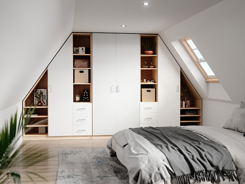 Durch die maßgefertigte Gestaltung können Sie den Schrank so planen, dass jeder Zentimeter optimal genutzt wird. Das ist besonders nützlich, wenn der Raum ungewöhnliche Formen oder Winkel hat, wie z. B. ein Raum mit Schräge im Dachgeschoss.