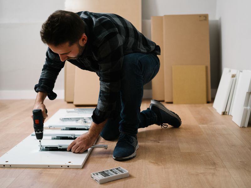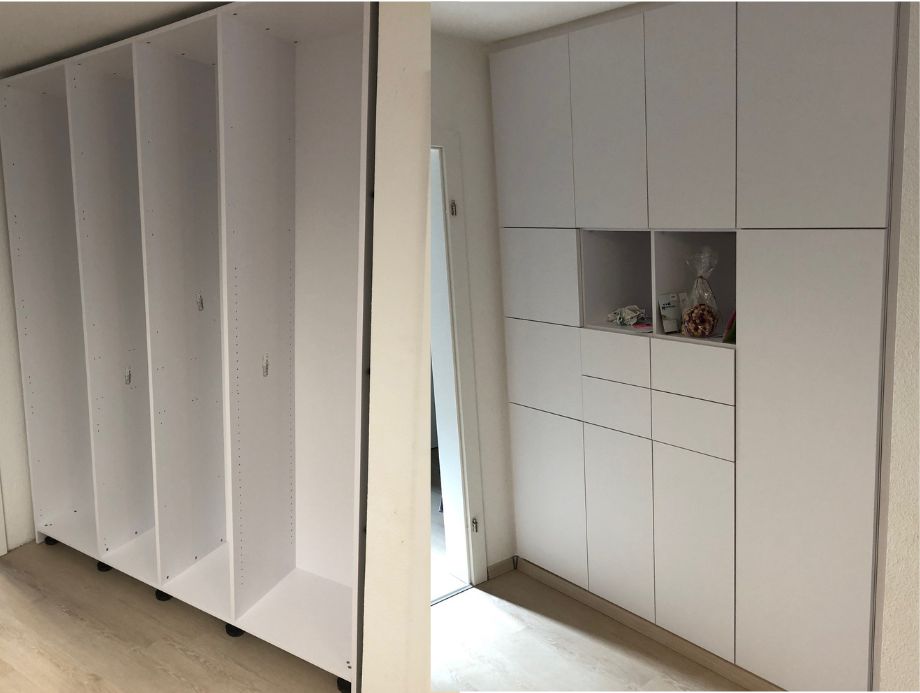 Der Traum vom passgenauen Einbauschrank ist ein großes Projekt, das Präzision und Geschick verlangt. Wer den Einbauschrank von Grund auf selbst planen und bauen möchte, benötigt gute Vorkenntnisse im Möbelbau. Da der Schrank meist mit Wand und Zimmerdecke abschließt, bleiben nur wenige Zentimeter Spielraum. Vorab sollte eine präzise Skizze und bestenfalls eine technische Zeichnung angefertigt werden. Hinzu kommen der Materialeinkauf und die Vorbereitung der Möbelplatten. Einen Einbauschrank komplett im DIY-Stil zu planen und zu realisieren, gibt Dir die Möglichkeit, zu 100 % über jedes Detail zu entscheiden, setzt aber umfassende Kompetenzen und Erfahrungen voraus.