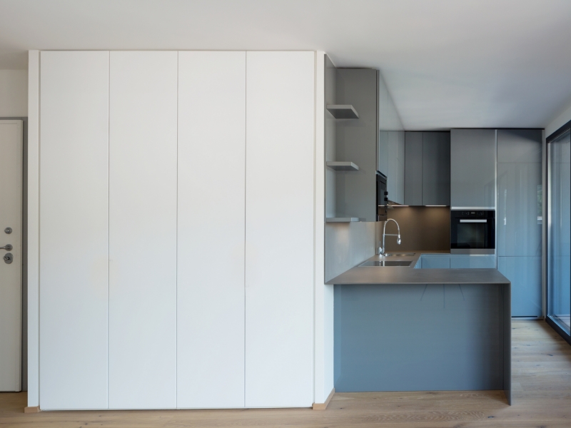 - Überlege, welche Art von Türen Du bevorzugst. Schiebetüren sparen im Bereich vor dem Schrank Platz, während Drehtüren einen einfacheren Zugang bieten. Bei Schiebetüren sollten zusätzliche Zentimeter über dem Schrank Platz gelassen werden. Denke auch über die Griffe oder eine grifflose Push-to-open-Lösung nach.
