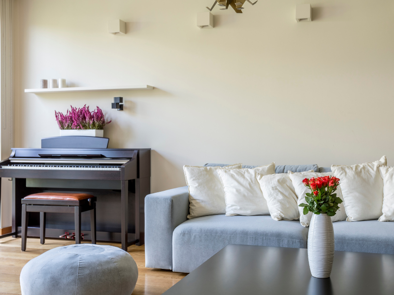 Ein dezent eingerichtetes Musikzimmer bietet Zeit und Raum für kreative Entfaltung und Erholung in ruhiger Atmosphäre. Ob Klavier, Gitarre oder Cello – stimme die Einrichtung auf das Musikinstrument ab. Lege Wert auf ein hochwertiges und komfortables Sitzmöbel, um auch Deinen Körper zu schonen und Ruhe zu gönnen. Neben der Musik kann ein musischer Raum auch als Mal-Rückzugsort dienen. Achte nur darauf, dass der Entspannungsraum nicht zum Kreativraum bzw. Atelier wird. Eine geordnete, aufgeräumte und beruhigende Umgebung ist wichtiger, als kreatives Chaos.