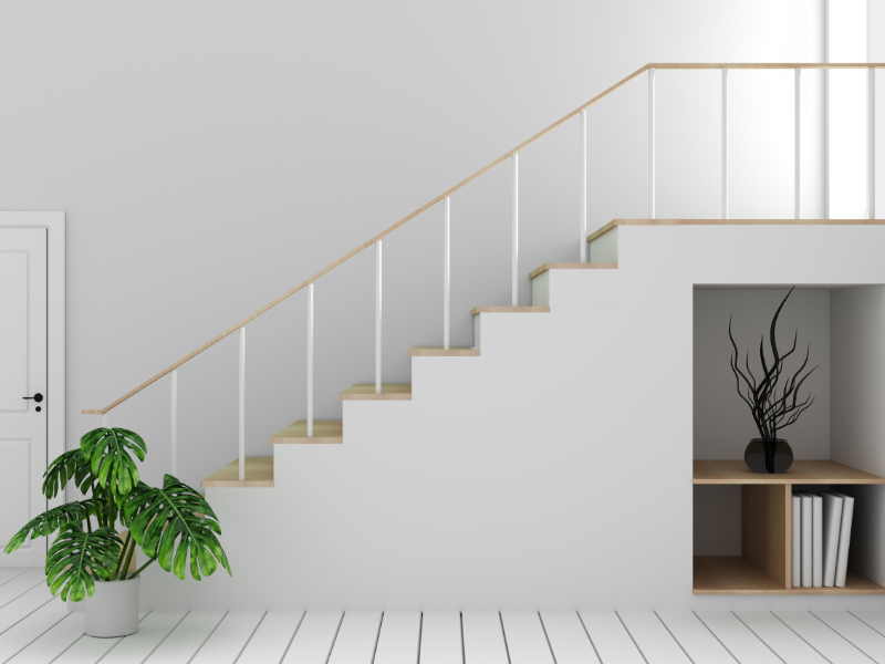 - Bei gewendelten Treppen mit Podesten findet man häufig kleine Nischen oder Wandbereiche, die sich als ein Bücherregal eignen.