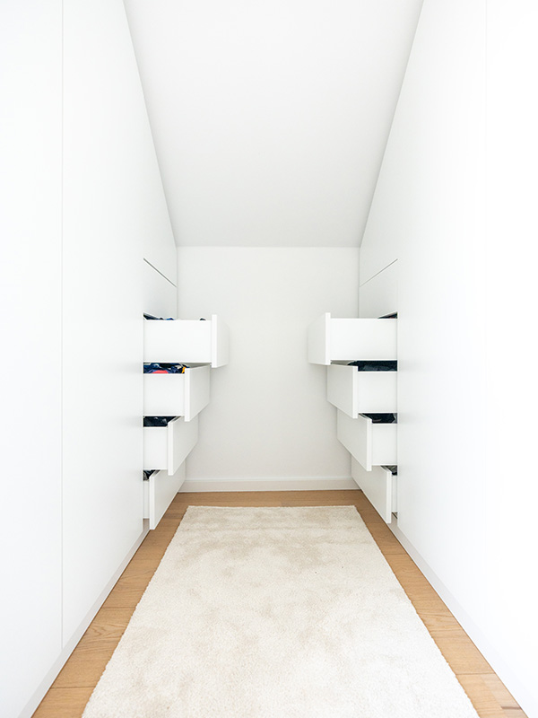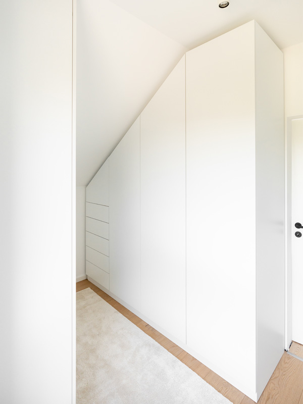 Im Fall dieses Ankleidezimmers wurde die Dachschräge ins Gesamtkonzept integriert. Während sich links und rechts die hohen Schrankmodule befinden, wurde der Kniestock unter dem Fenster mit einem maßgefertigten Drempelschrank ausgestattet.
