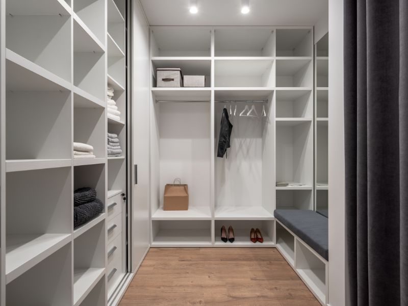 Wenn wenig Platz zur Verfügung steht, können Einbauschränke oder Schränke ohne Türen eine gute Idee für das Ankleidezimmer sein