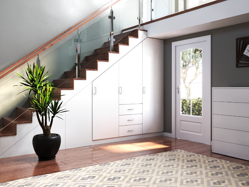 Fast schon ein Klassiker: der schlecht zu bespielende Platz unterhalb der Treppe, die ins obere Geschoss führt, kann mit den passenden Möbeln zum praktischen Stauraum umfunktioniert werden. Maßgefertigte Schränke gestaltest Du so, dass diese millimetergenau unter die Treppe passen und den Staubsauger fast unsichtbar und harmonisch verschwinden lassen. Du „füllst“ diese Fläche mit Stauraum, die Du sonst ohnehin kaum für andere Dinge nutzen könntest.