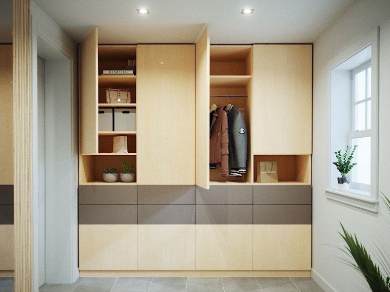 – Schmale Schränke und Regale – auch in niedrigen Räumen müssen Dinge verstaut werden. Mit schmalen hohen Schränken und Regalen, die Du noch durch Aufsatzschränke erweitern kannst, bringst Du alle Sachen unter. Die Möbel wirken elegant. Wähle eher einen hellen Farbton wie Beton, Sand, Creme oder ein helles Holz-Dekor.