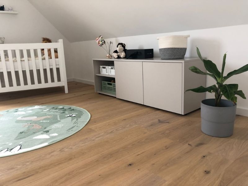 Streiche z. B. die Decke in einem Ton der gleichen Farbfamilie, nur einen Tick heller. Dadurch erscheint die Decke weiter weg, ohne den Blick an sich zu reißen, wie es ein harter Kontrast zur Folge hätte.