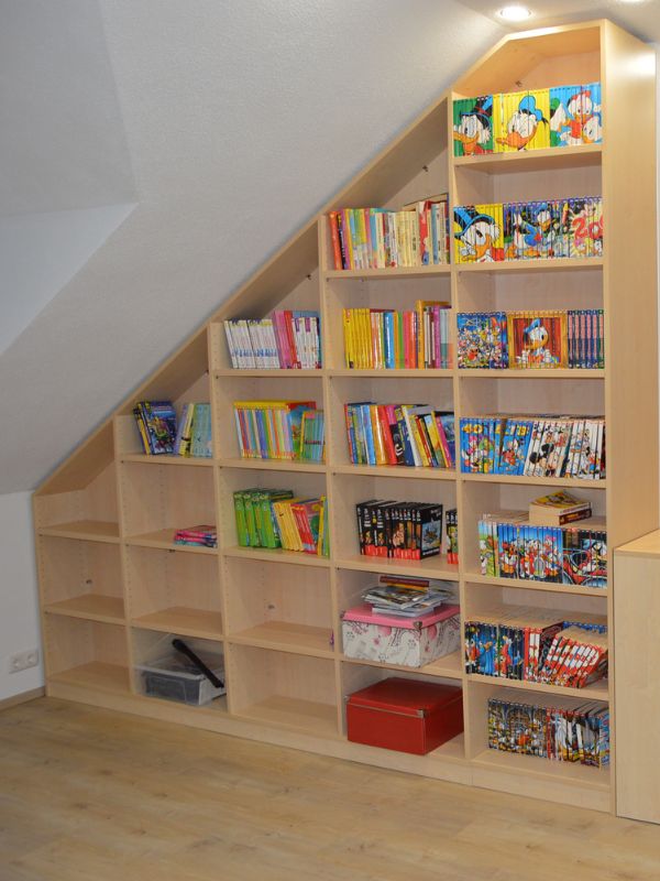 Das klassische Bücherregal – nur eben mit individuellem Touch. Einzelne Bücher wie schön designte Fotobände oder großformatige Bilderbücher verdienen eigene Fächer, die das Cover präsentieren. Bücherschränke kannst Du um Fenster und Türen herum planen – dann mit integrierten Hängeregalen. Das schafft eine große Bücherwand und den Eindruck einer eigenen Bibliothek.