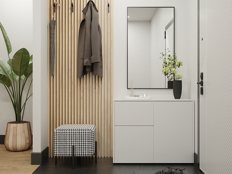 Christin und ihr Ehemann sind 2017 bereits in ihr eigenes Haus gezogen und haben sich den Traum vom Eigenheim erfüllt. Für den Übergang sind vorerst die Möbel aus der alten Wohnung in den Flur eingezogen. Mittlerweile ist die junge Familie zu viert und in ein paar Monaten kommt hoffentlich sogar, als fünftes Familienmitglied, ein Hund dazu. Für Christin war klar: wir brauchen mehr Ordnung und Struktur im Flur. So entstanden zwei geräumige Garderobenschränke nach Maß mit modernen Lamellenwänden im Hintergrund. Erfahre mehr über das schrankwerkstück Juli 2023.