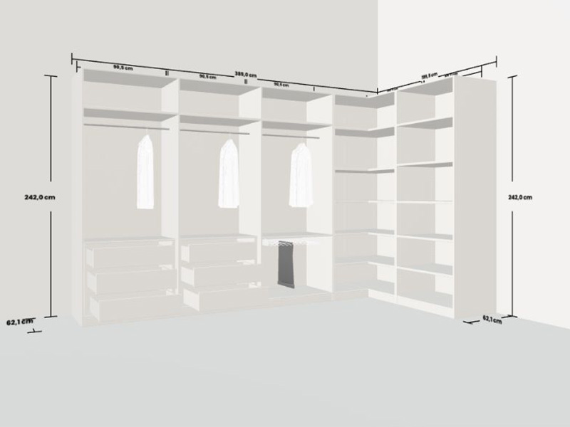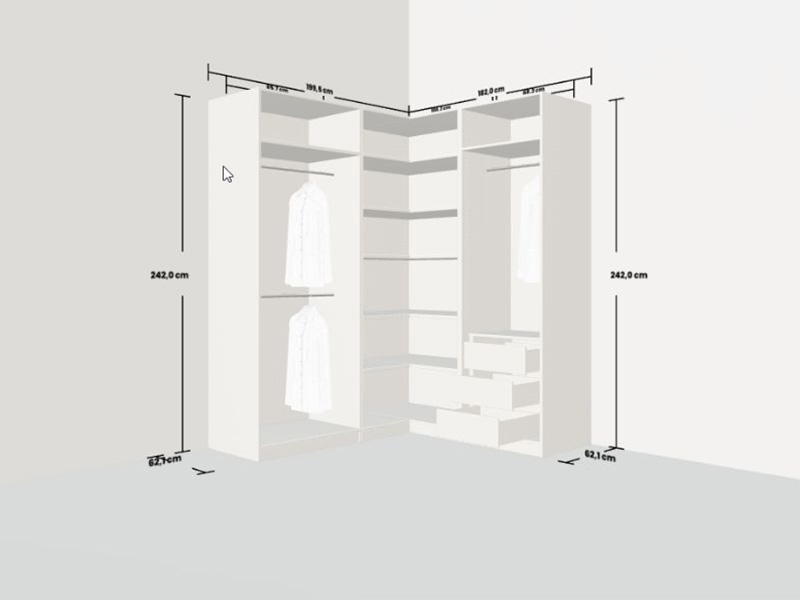 Bei der Planung ist so beachten, dass der Raum rechtwinklig ist und die Ecke 90° beträgt. Die Breite und Tiefe des Raums müssen für die Konfigurationen von Eckschränken passend sein.